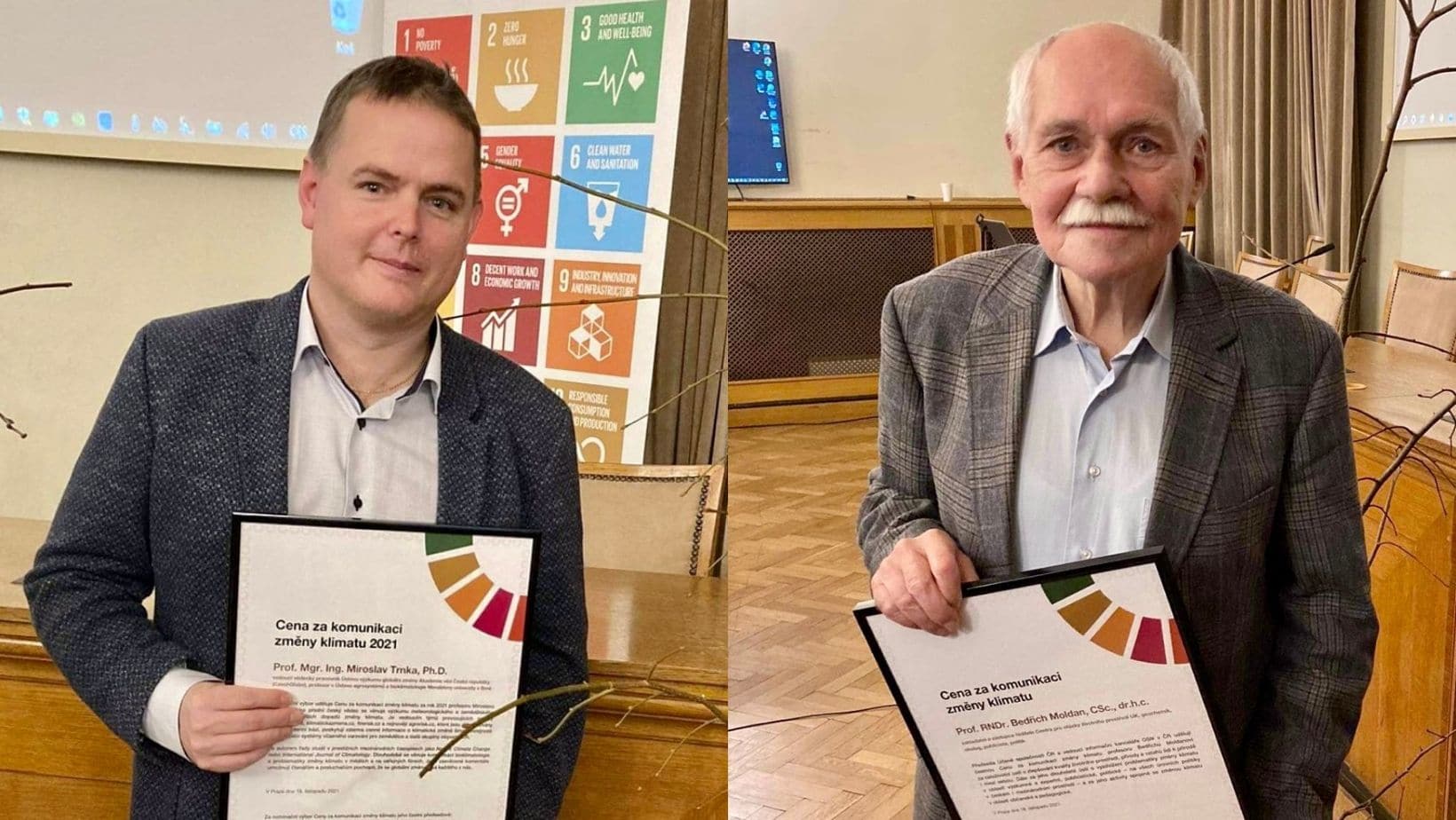 Libor Grubhoffer, Učená společnost ČR: „Učené společnosti České republiky leží na srdci udržitelnost života na Zemi a ta je přímo podmíněna udržitelným klimatem. Člověk však svojí krátkozrakou činností ve prospěch exponenciálního růstu ekonomické prosperity a blahobytu prohlubuje negativní dopady na klima. Děje se tak v globálním měřítku. Naštěstí si lidstvo začalo uvědomovat naléhavost situace a díky soustředěnému tlaku odborníků z oblasti přírodních i společenských věd a komunikace se i v klimatu blýská na lepší časy. Do mozaiky pozitivních změn přispívá i společná Cena za komunikaci klimatu, kterou již tradičně uděluje pražské Informační centrum OSN s Učenou společností ČR.“